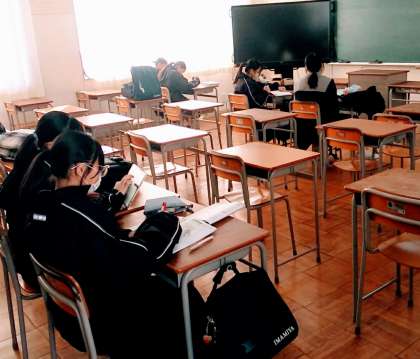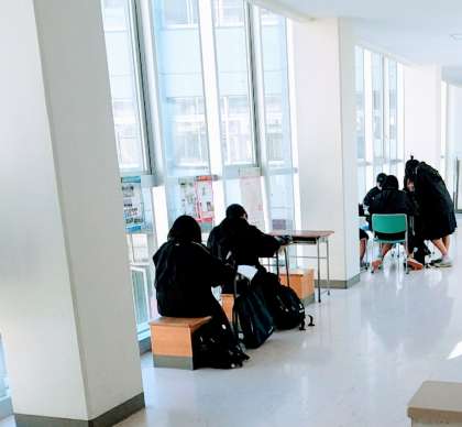 9年生たちが渡り廊下や空き教室で、進路相談待ちとして、いろんな教材を自学自習をしている様子です。