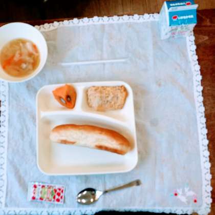 11月17日(金)、今日の献立は、おさつパン、ツナポテトオムレツ、スープ、かき(富有柿)【小学生】、黄桃の缶詰【中学生】、牛乳です。