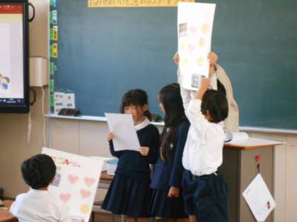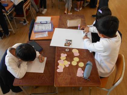 2年生は、町たんけんで見学させていただいたお店のポスターを作りました。お店のいいところをいっぱい見つけて、それをポスターに書いていました。どの児童もとても楽しそうにポスター作りを頑張っていました。