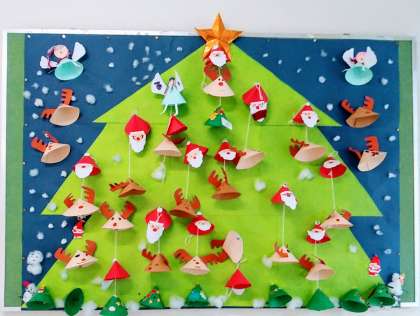 新館職員室前階段2階から3階にかけての踊り場に、温かくて楽しい作品が掲示されています