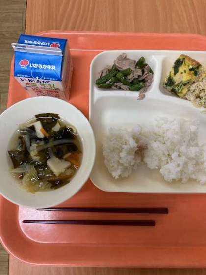 12月5日(火)、今日の献立は、ごはん、具だくさん卵の千種焼き、五目汁、豚肉とさんどまめのいためもの、牛乳です。