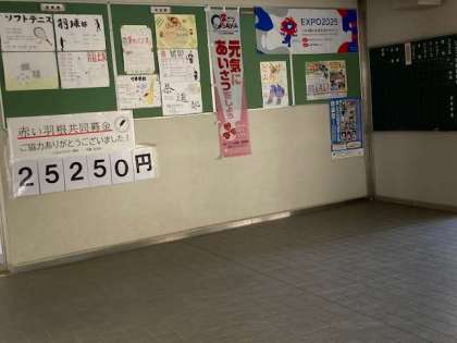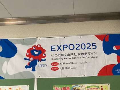 本校1Fピロティには部活動黒板や多くの掲示物あり、児童生徒に様々な情報をお知らせしています。その中に昨日から関西万博2025の横断幕が加わりました。