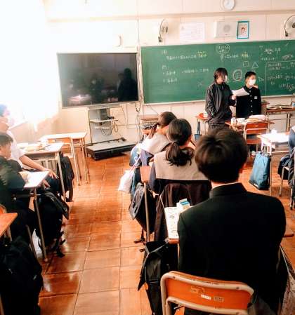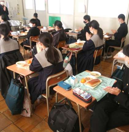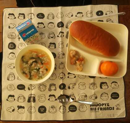 12月13日(水)、今日の献立は、黒糖パン、鮭のマリネ、肉団子と麦のスープ、みかん、牛乳です。