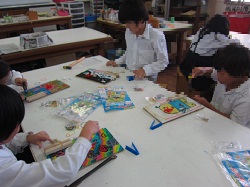 3年生の図工の学習のようすです。くぎとかなづちを使って、ぱちんこを作っています。お気に入りの絵を描いた板にくぎを打っていきました。玉を発射させるガイドを取り付けたり、打ち付けたくぎに輪ゴムをまいたりして、作品を作っていきました。「ここは20点で、ここは50点やねん。」「−10点も作ってるよ。」など、遊びのルールも親切に教えてくれました。素敵な作品に仕上げてほしいです。