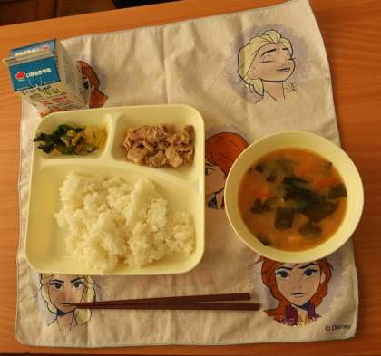 12月14日(木)、今日の献立は、ごはん、豚肉のネギじょうゆ焼き、みそ汁、きくなとはくさいのごまあえ、牛乳です。