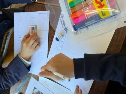 テキストやタブレットで調べた様々な国の紹介をするパネル作りをしています。