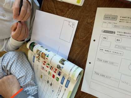 英語を書いたり、国旗を描いたり、一生懸命取り組む姿が見られました。
