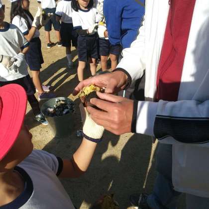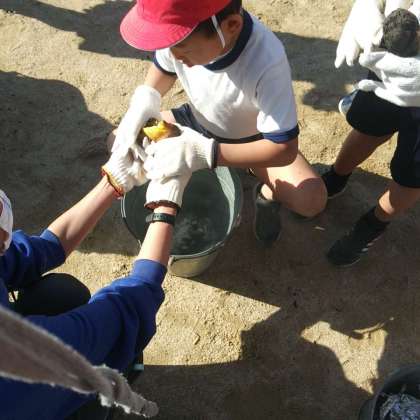先生たちに焼き上がった焼き芋の外側の焦げた皮を取ってもらい、焼き芋の香りや湯気に包まれたみんなの表情には笑顔が溢れていました。
