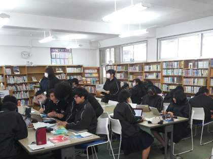 12月18日(月)、9年生たちが図書室でタブレットを使いながら、図書室の利用者を増やすためのポスターを制作していました。