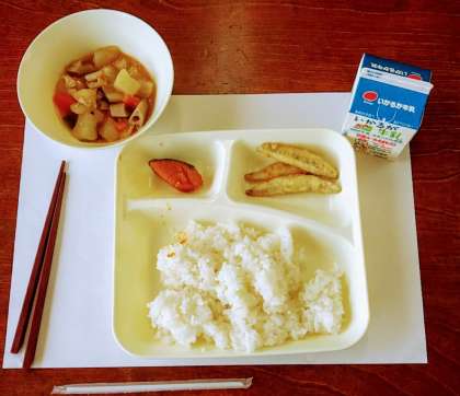 12月21日(木)、今日の献立は、ごはん、きびなごてんぷら、含め煮、焼きかぼちゃの甘みつかけ、牛乳です。