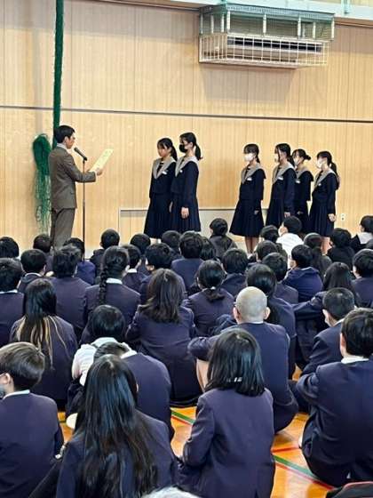 軟式テニス部のみなさんに、ブロック大会での表彰の伝達がありました。