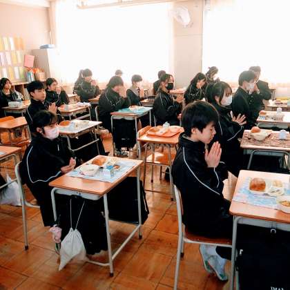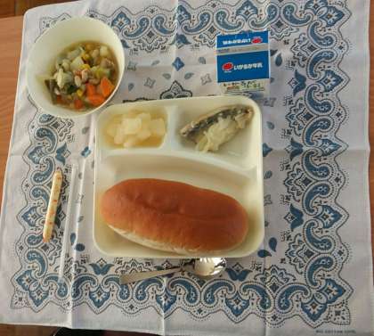 1月11日(木)、今日の献立は、黒糖パン、あじのレモンマリネ、てぼ豆のスープ煮、和なしの缶詰、棒チーズ【中学生のみ】、牛乳です。