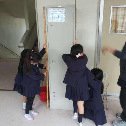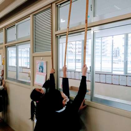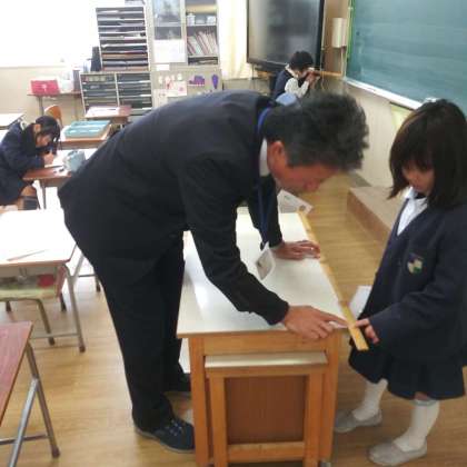 1月16日(火)、2年1組では、1mものさしを使って、教室や廊下の色々なものの長さをみんなで協力し、測っていました。