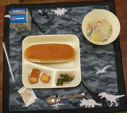 1月16日(火)、今日の献立は、コッペパン、ソフトマーガリン、白菜のクリーム煮、厚揚げのピリ辛じょうゆけ、豚肉と三度豆のオイスターソース炒め、牛乳です。「牛乳」には、たんぱく質やカルシウム、ビタミン類のほかに脂質などが含まれています。特に不足しがちなカルシウムが豊富なため、成長期にとりたい食品の一つです。