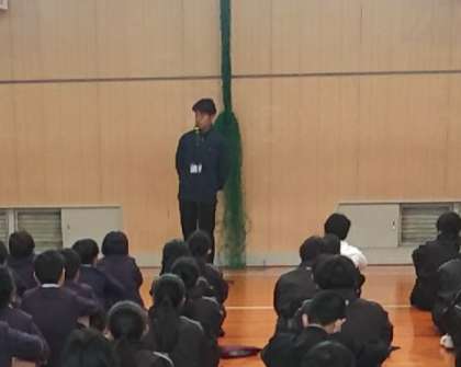 小中合同朝会にて、生活指導の先生から登下校についてのお話がありました。