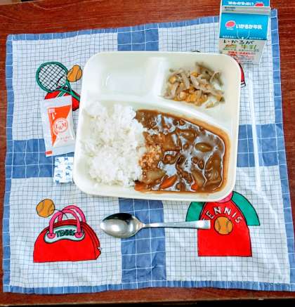 1月22日(月)、今日の献立は、牛肉と金時豆のカレーライス、ごぼうサラダ[ノンエッグドレッシング]、固形チーズ、焼きミニハンバーグ【中学生のみ】、牛乳です。