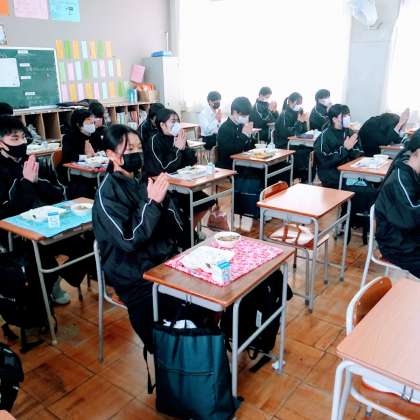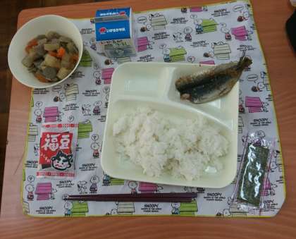 給食では、節分の行事献立として「イワシのしょうがじょうゆかけ」と「いり大豆」が出ました。