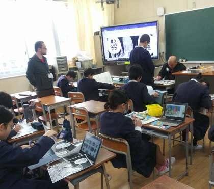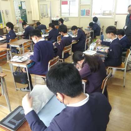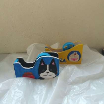 6年生たちは、テープカッターの側面を色彩よく色付けしていました。