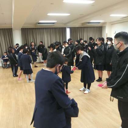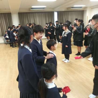 2月7日(水)、交流ホールにて、1・6年生から9年生への手作りのお守りを送るというセレモニーが行われました。