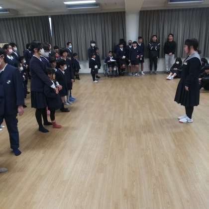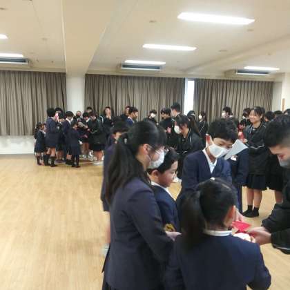 1・6年生たちから9年生にメッセージの入ったお守りを渡された後、9年生代表から1・6年生たちにお礼のあいさつがありありました。9年生たちの手には、心のこもったお守りが握られていました。