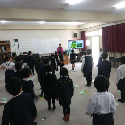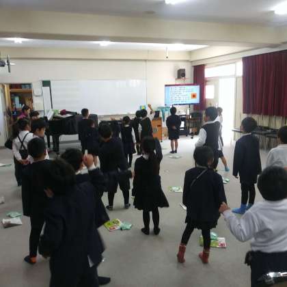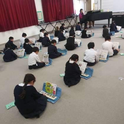2月7日(水)、小学校の音楽室にて、1年生たちが、歌って、踊って、鍵盤ハーモニカを奏でていました。