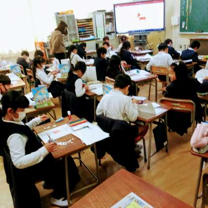 2月8日(木)、3年生は、さまざまな形を英語で学び、その形を使って、「Greeting Card」を作っていました。