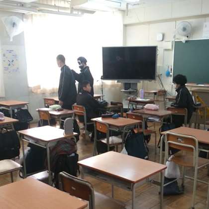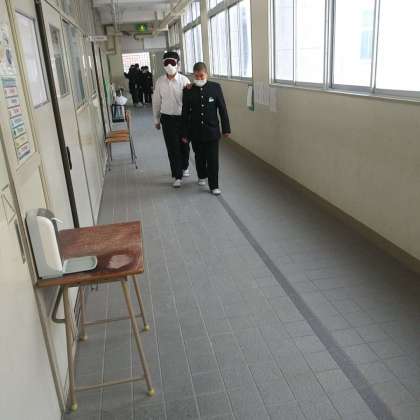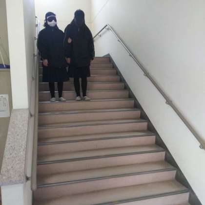 7年の各教室や教室前廊下や階段を使用して、アイマスク体験にも挑戦していました。