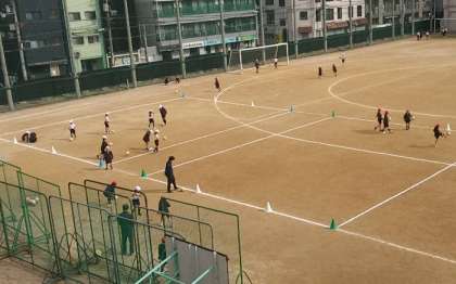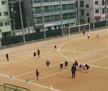 2月15日(木)、3年生たちは、サッカーボールで体をほぐした後、ドリブルやゲームに取り組んでいました。