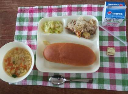 2月16日(金)、今日の献立は、コッペパン、バター、中華おこわ、卵スープ、キャベツのオイスターソース炒め、牛乳です。