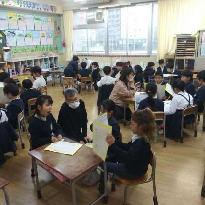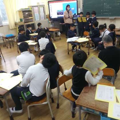 2月19日(月)、1年生たちは、明日の若草保育園の交流会に向けて、グループ活動をしていました。
