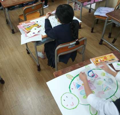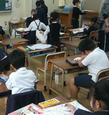 2月21日(水)、1年生たちは、「こすってもようをつけよう」と、クレヨンを指先に付けて、△、□、☆などの形を魚や亀や蝶々の模様として使い、色付けをしていました。