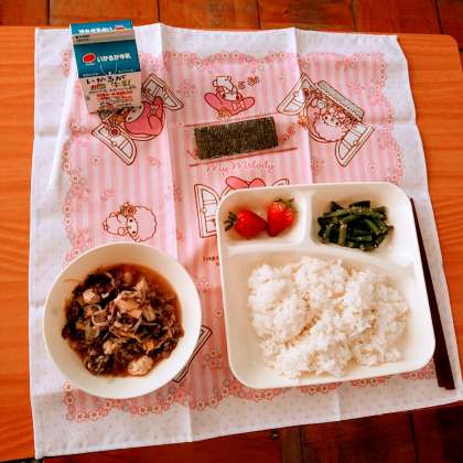 2月28日(水)、今日の献立は、ごはん、すき焼き煮、さんどまめのごまあえ、苺、焼きのり【中学生のみ】、牛乳です。