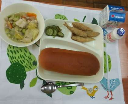 2月29日(木)、今日の献立は、黒糖パン、わかさぎフライ、洋風煮、きゅうりのピクルス、発酵乳【中学生のみ】、牛乳です。