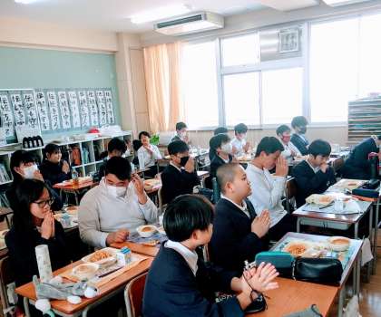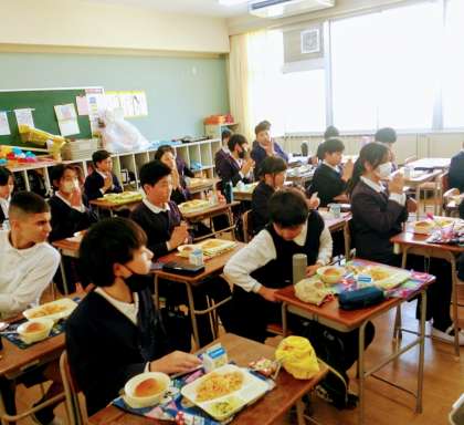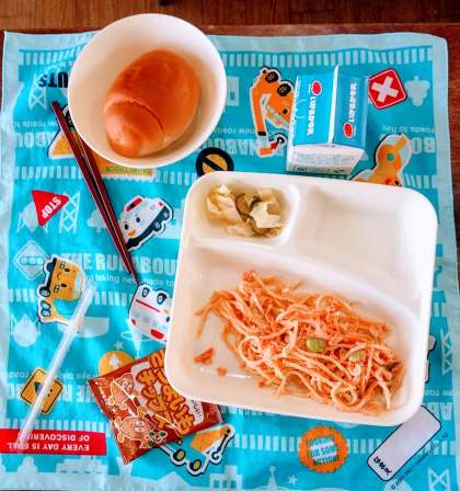 3月4日(月)、今日の献立は、小黒糖パン、さけのクリームスパゲッティ、キャベツときゅうりのサラダ、おさつチップス、牛乳です。