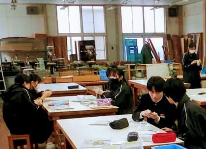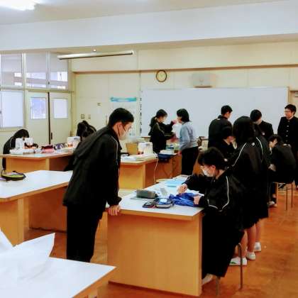 3月5日(火)、9年1組の2組同様、技術室と被服室の授業の様子です。作品が完成した生徒は、工程途中の生徒に協力しています。