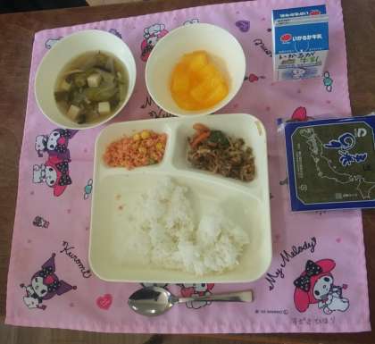 3月8日(金)、今日の献立は、手巻きご飯(牛肉のコチジャン炒め、鮭のカラフルそぼろ)、すまし汁、ダイスゼリー(みかん)、牛乳です。