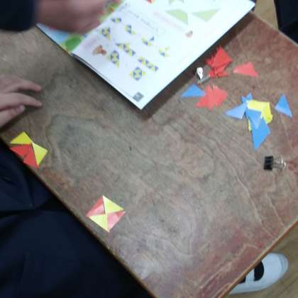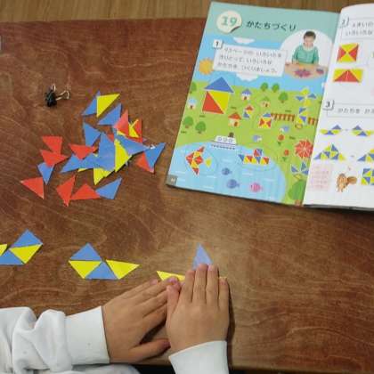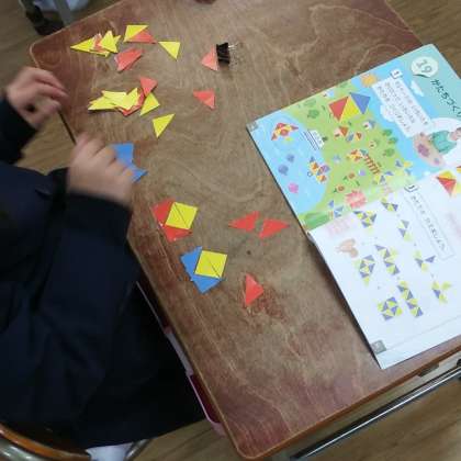 3月12日(火)、1年生たちは、教科書の巻末にある彩りのよい三角形を組み合わせて、形作り学習に取り組んでいました。