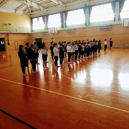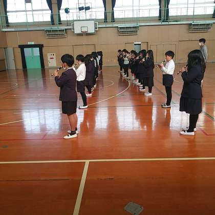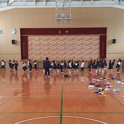 3月14日(木)、体育館にて、1年生から5年生の児童たちが、6年生の卒業をお祝いするために、工夫を凝らした出し物の練習に取り組んでいました。
