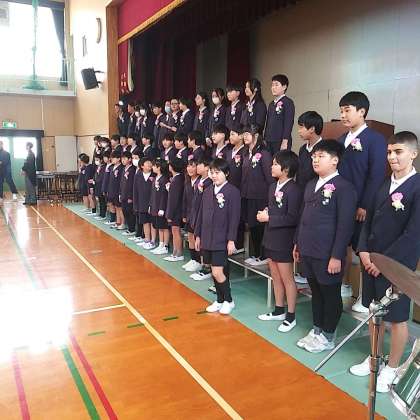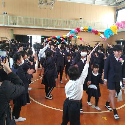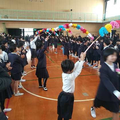 卒業証書授与式後、交流ホールから体育館に場所を移して、小学校卒業を祝う会が行われました。6年生が1年生のエスコートで入場です。