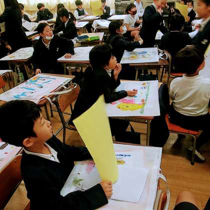 各学年で、オリジナルバッグを製作し、宿題や一年間の提出物や道具箱など大きな物を持って帰ります。作品とともにバッグも見てあげてくださいね。