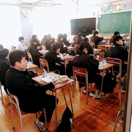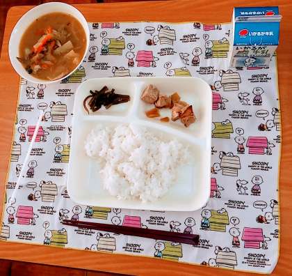 3月21日(木)、今日の献立は、ごはん、マグロの甘辛焼き、豚汁、茎ワカメの佃煮、牛乳です。