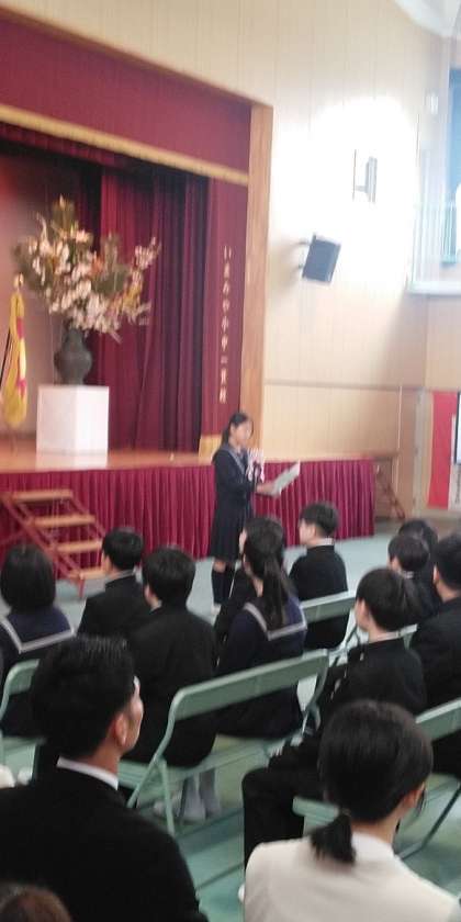 晴天の下、桜が満開に咲き誇る中で入学式を行うことができました。新七年生はしっかりとした足取りで入場し、続いての新一年生は少し緊張した面持ちでしたが、お友だちと仲良く入場することができました。校長先生やPTA会長のお話をしっかりと聞くことができ、とてもよく頑張っていました。