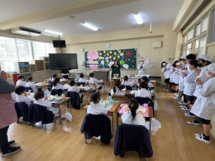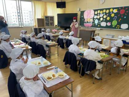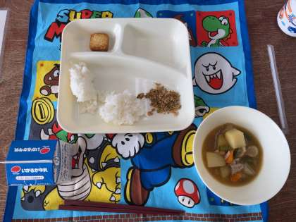 本日は、ごはん、鶏肉とじゃがいもの煮もの、あつあげのしょうゆだれかけ、紅ざけそぼろ、牛乳です。