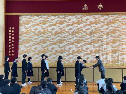 最初に男子バスケットボール部の表彰があり、認証式、校長先生・生徒指導主事先生のお話と続きました。