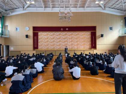 4月15日の月曜日の朝、中学校全校集会が体育館で行われました。