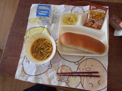 この日の給食は、黒糖パン、カレースープスパゲッティ、キャベツのピクルス、おさつチップス、牛乳です。