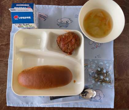 本日の献立は、黒糖パン、煮こみハンバーグ、野菜スープ、ミニフィッシュ、牛乳です。
