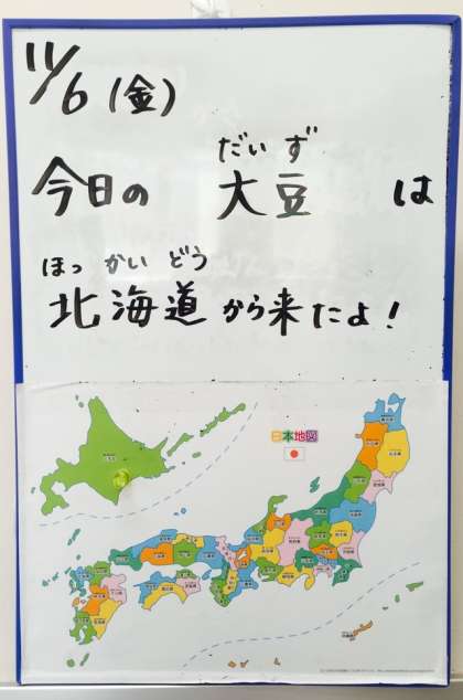 給食の五目豆は、大豆と一緒に蓮根やニンジンも軟らかく煮ています。煮豆は苦手な子どもたちもいますが、給食で少しずつでも食べられるようになってくれると嬉しいなと思います。