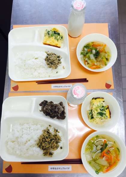 千草焼とは鶏肉やシイタケなどいろいろな具材が入った卵焼きのことです。具材と卵の各々に下味をつけて、1クラスずつに分けてオーブンで焼き上げました。三つ葉の香りもよく、ご飯にもよく合う献立です。