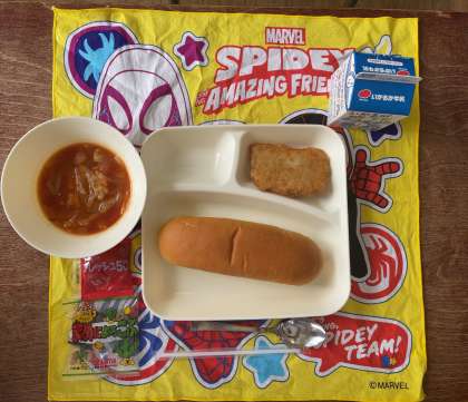 本日の献立は、コッペパン、一口トンカツ、ミネストローネ、豆昆布、牛乳です。